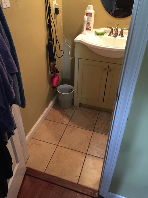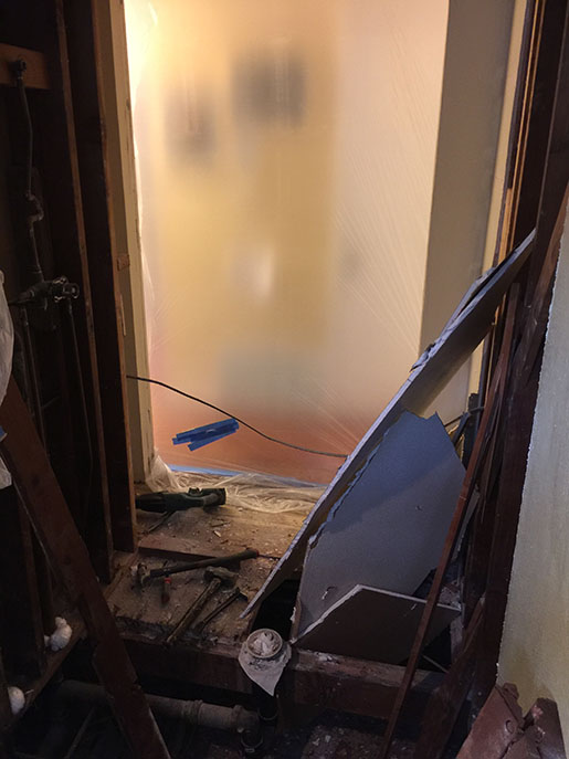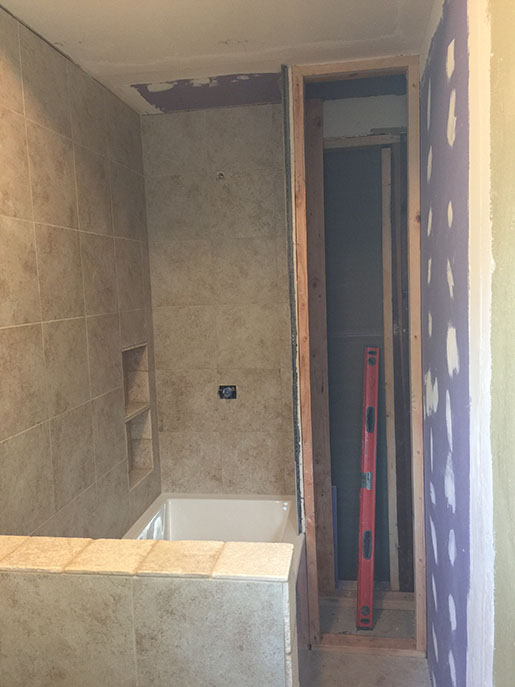 Once the floor was pulled back, I noticed on the opposite side of the shower wall, there was a closet that was being used for linen. I asked the homeowner if she was willing to move the closet around the corner so I could knock down that wall to make the shower space big enough to include a jetted tub. Of course, she agreed! Hello – it’s a jetted tub!