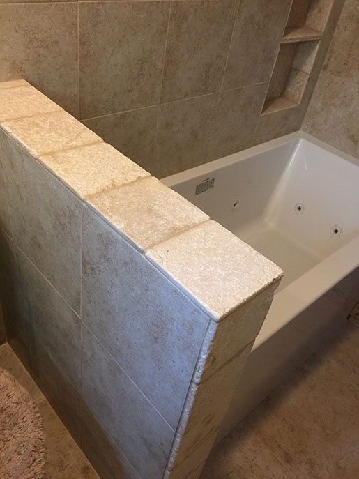 We adjusted the plumbing, fixed the floor, and set the jetted tub with a custom tile surround, including the floors & pony wall. We then installed a new toilet, a new set of shelves, new vanity, and closed the closet door opening with drywall, tape, and texture.