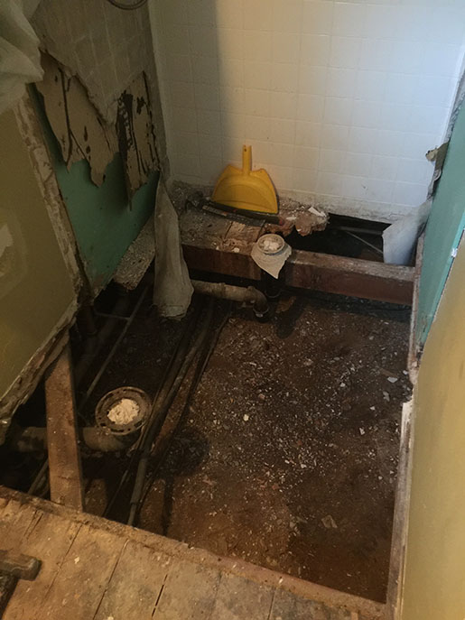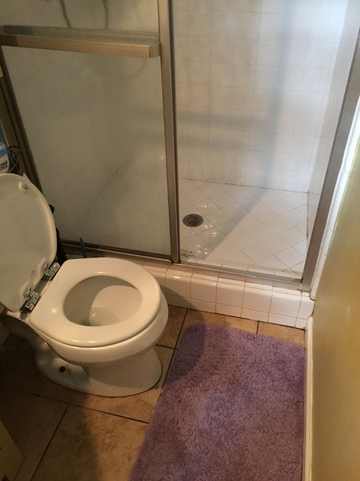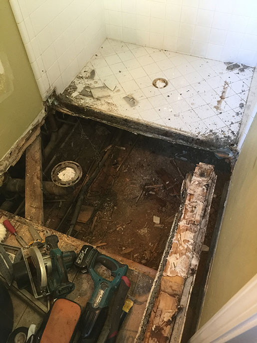 This bathroom remodel started with dry rot in the floor due to a water leak in the shower pan. We ripped out the shower, toilet, and vanity.